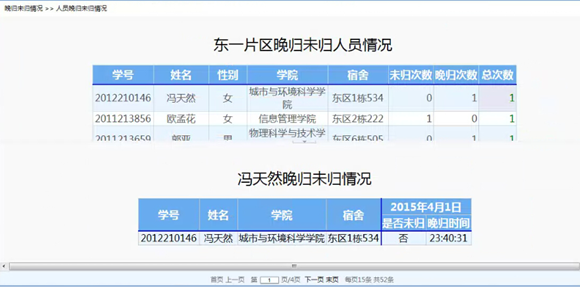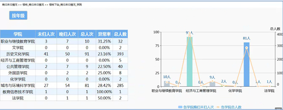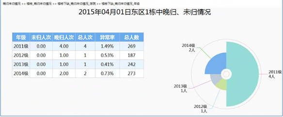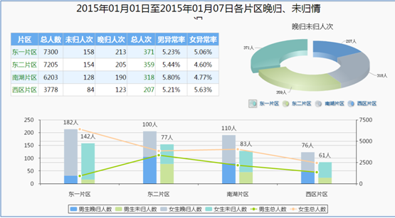 通過(guò)時(shí)間參數(shù)段內(nèi)的未歸人次、晚歸人次、男女異常率指標(biāo)展示。