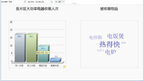 該部分內(nèi)容主要以圖形顯示,是柱狀圖和詞云圖的結(jié)合體。鉆取到最細(xì)力度是學(xué)生未歸電器收繳明細(xì)列表,包括學(xué)生的基本信息以及收繳的電器和收繳時(shí)間。