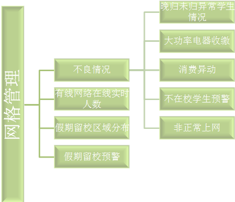 網(wǎng)格部分旨在進(jìn)行網(wǎng)格化數(shù)據(jù)分析與展現(xiàn),涉及內(nèi)容包括宿舍管理,學(xué)生學(xué)業(yè)、生活、消費(fèi)健康安全等各項(xiàng)內(nèi)容。何謂網(wǎng)格化管理,即仿效社區(qū)的網(wǎng)格化管理,按照一定的規(guī)則劃分成網(wǎng)格單元,每個(gè)網(wǎng)格單元分別管理。目標(biāo)更加明確,管理更加細(xì)致。
