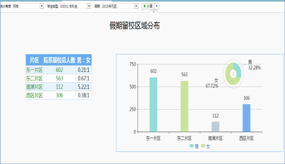 留校區(qū)域使用混合圖,柱子展現(xiàn)人數(shù)、餅圖展現(xiàn)男女比例,支持維度下鉆以及人數(shù)下鉆至明細(xì)列表。預(yù)警部分類似不在校預(yù)警,僅列入假期信息。