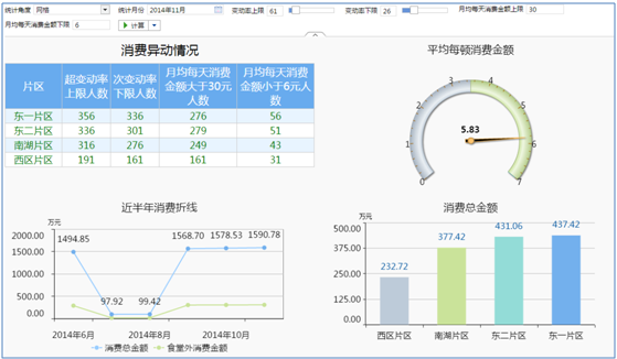 通過(guò)學(xué)生在食堂刷卡消費(fèi)的明細(xì)數(shù)據(jù)進(jìn)行整體分析,統(tǒng)計(jì)異動(dòng)人次,再則鉆取到其消費(fèi)明細(xì)。參數(shù)多樣,可滿足不同要求標(biāo)準(zhǔn)的數(shù)據(jù)展現(xiàn)。