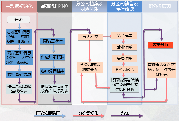 系統主要從醫藥零售角度,通過采集商品、運營、會員3方面的數據,并建立廣榮自身的主數據庫,從而對連鎖藥店進行商品銷售、門店運營情況、各店會員行為數據進行分析。(2018年9月,廣榮醫藥新成立廣州睿思達咨詢公司,旨在專門依據此系統,提供數據咨詢,優化方案等服務。系統更名為“藥CT零售大數據BI系統”)