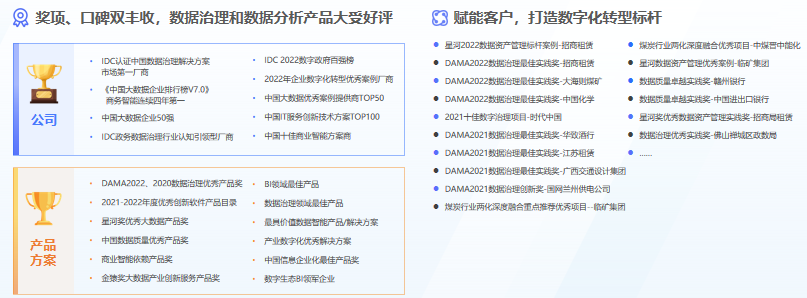 作為大數據行業的領軍企業,億信華辰敏銳把握市場需求,精益求精不斷進步,不斷打磨兩大核心產品——億信ABI與睿治數據治理平臺。憑借創新、易用、強大的特性,產品自發布以來持續領先于同時代其他產品,受到客戶廣泛認可,打造出多個數字化轉型標桿,并拿下眾多殊榮:多次入選Gartner《中國分析平臺市場指南》代表廠商,三度斬獲DAMA數據治理優秀產品獎,蟬聯IDC中國數據治理解決方案市場第一……