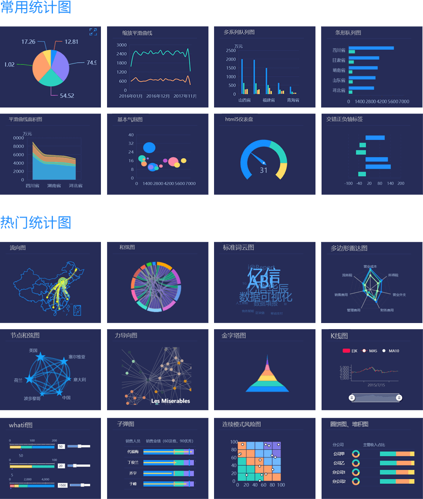 ABI采用JS、FLASH、HTML5三種技術(shù)自主開發(fā)統(tǒng)計(jì)圖,豐富的統(tǒng)計(jì)圖保證了其具有美觀的圖形展現(xiàn)能力,除了常用的柱狀圖、線狀圖、條形圖、面積圖、餅圖、點(diǎn)圖、儀表盤、走勢(shì)圖外,還支持和弦圖、圈餅圖、金字塔、漏斗圖、K線圖、關(guān)系圖、網(wǎng)絡(luò)圖、玫瑰圖、帕累托圖、數(shù)學(xué)公式圖、預(yù)測(cè)曲線圖、正態(tài)分布圖、迷你圖等,樣式包括2D、3D、EXCEL、AUTUMN、FLASH等;通過(guò)組合設(shè)計(jì)可以搭配處上千種視覺效果。