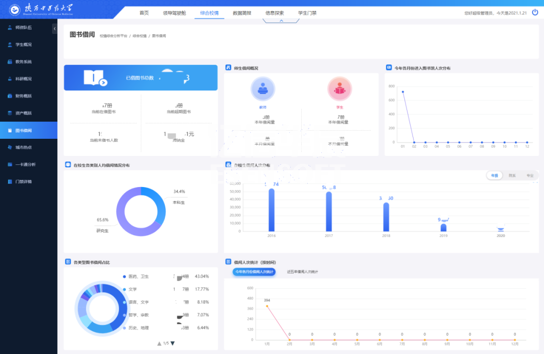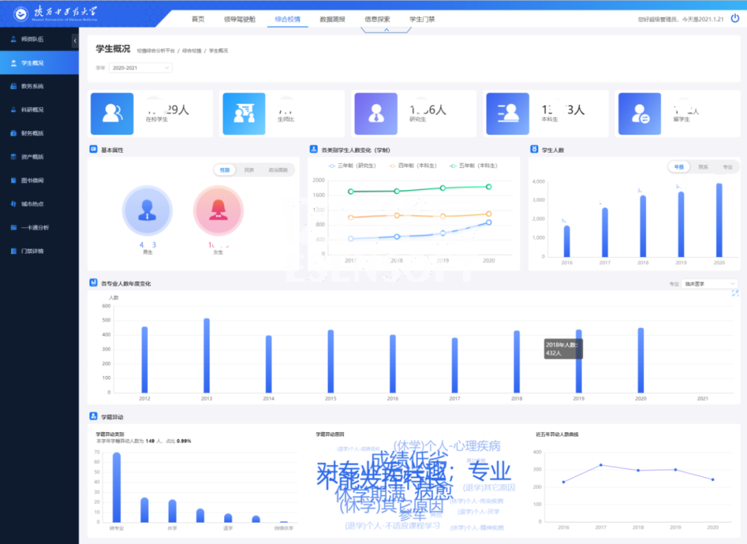 陜西中醫(yī)藥大學(xué)利用億信ABI建設(shè)了統(tǒng)一的校情綜合分析平臺,涉及內(nèi)容包括首頁、領(lǐng)導(dǎo)駕駛艙、綜合校情、數(shù)據(jù)簡報(bào)、信息探索和學(xué)生門禁等各項(xiàng)內(nèi)容。通過數(shù)據(jù)化運(yùn)營改進(jìn)數(shù)據(jù)收集和管理方式,用數(shù)據(jù)驅(qū)動(dòng)業(yè)務(wù),對業(yè)務(wù)數(shù)據(jù)進(jìn)行可視化分析,以提升學(xué)校管理水平和服務(wù)能力。