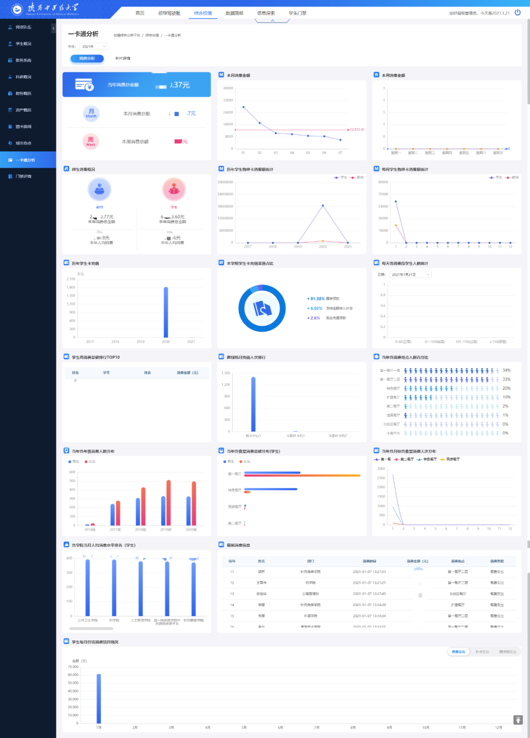 一卡通分析頁面通過對全校師生消費(fèi)和卡片進(jìn)行分析,可以讓學(xué)校管理者對在校師生的消費(fèi)情況和規(guī)律有一個(gè)量化的認(rèn)識,從而能夠合理地分配資源,降低管理成本,這對校園的規(guī)劃建設(shè)和學(xué)校學(xué)生管理工作都具有重要的作用。如下圖: