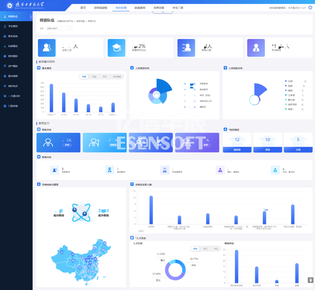 豐富的校情可視化數(shù)據(jù)看板 在綜合校情查詢與主題分析角度,對教務(wù)教學(xué)、科研、資產(chǎn)、財(cái)務(wù)、人事與學(xué)生管理、一卡通等業(yè)務(wù),進(jìn)行結(jié)構(gòu)、趨勢、分布等綜合分析,讓各級領(lǐng)導(dǎo)一屏在手,掌握全局,多種指標(biāo)實(shí)時(shí)隨地呈現(xiàn),助力科學(xué)決策。 師資隊(duì)伍 高校師資隊(duì)伍建設(shè)的優(yōu)劣決定了高校人才培養(yǎng)質(zhì)量的高低。如何在大數(shù)據(jù)時(shí)代科學(xué)利用源于高校各個(gè)層面的海量數(shù)據(jù),并使之成為高校師資隊(duì)伍建設(shè)的參考與方向,是眾多高校需要解決的問題。師資隊(duì)伍頁面通過展現(xiàn)教職工主要的屬性指標(biāo),分析了目前高校師資隊(duì)伍建設(shè)中所存在的問題,對加強(qiáng)高校師資隊(duì)伍建設(shè)起到指導(dǎo)作用。如下圖: