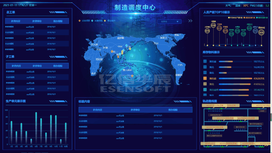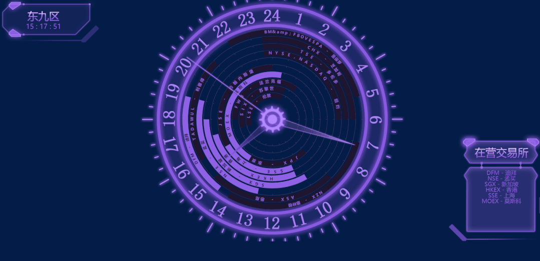 輔助圖表通常圍繞視覺(jué)中心的四周,起到錦上添花的作用,用來(lái)呈現(xiàn)次要指標(biāo),從各種維度進(jìn)一步細(xì)化核心指標(biāo)。時(shí)間類組件 時(shí)鐘