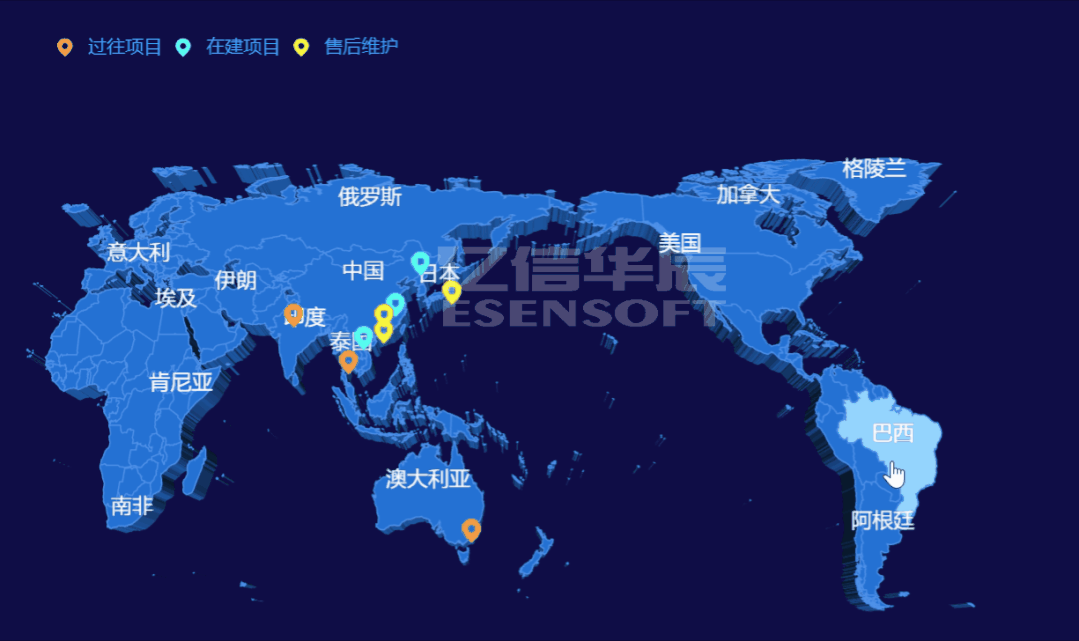 將標(biāo)點(diǎn)和地圖相結(jié)合,以地圖為背景,將每個(gè)國(guó)家的數(shù)據(jù)通過(guò)標(biāo)點(diǎn)的形式直觀呈現(xiàn)。