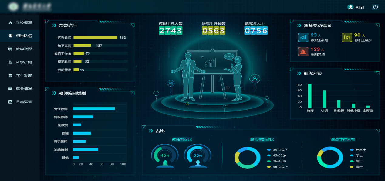 為了展現學校的實力,分別從學校概況、師資隊伍、教學資源、科學研究、學生發展、就業情況和日常運營的角度來展示。學校概況包括辦學條件、師生情況、學科專業和師資力量,再通過榮譽稱號、教師編制類別、教職工人數、研究生導師數、高層次人才、職稱分布、最高學位分布等展示師資隊伍,用教學用房面積、教學經費投入、教學科研儀器、圖書資料等來表現教學資源,用著作成果、獲獎成果、論文與專利等展現科學研究。