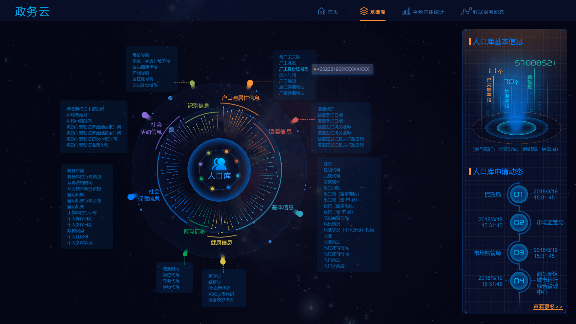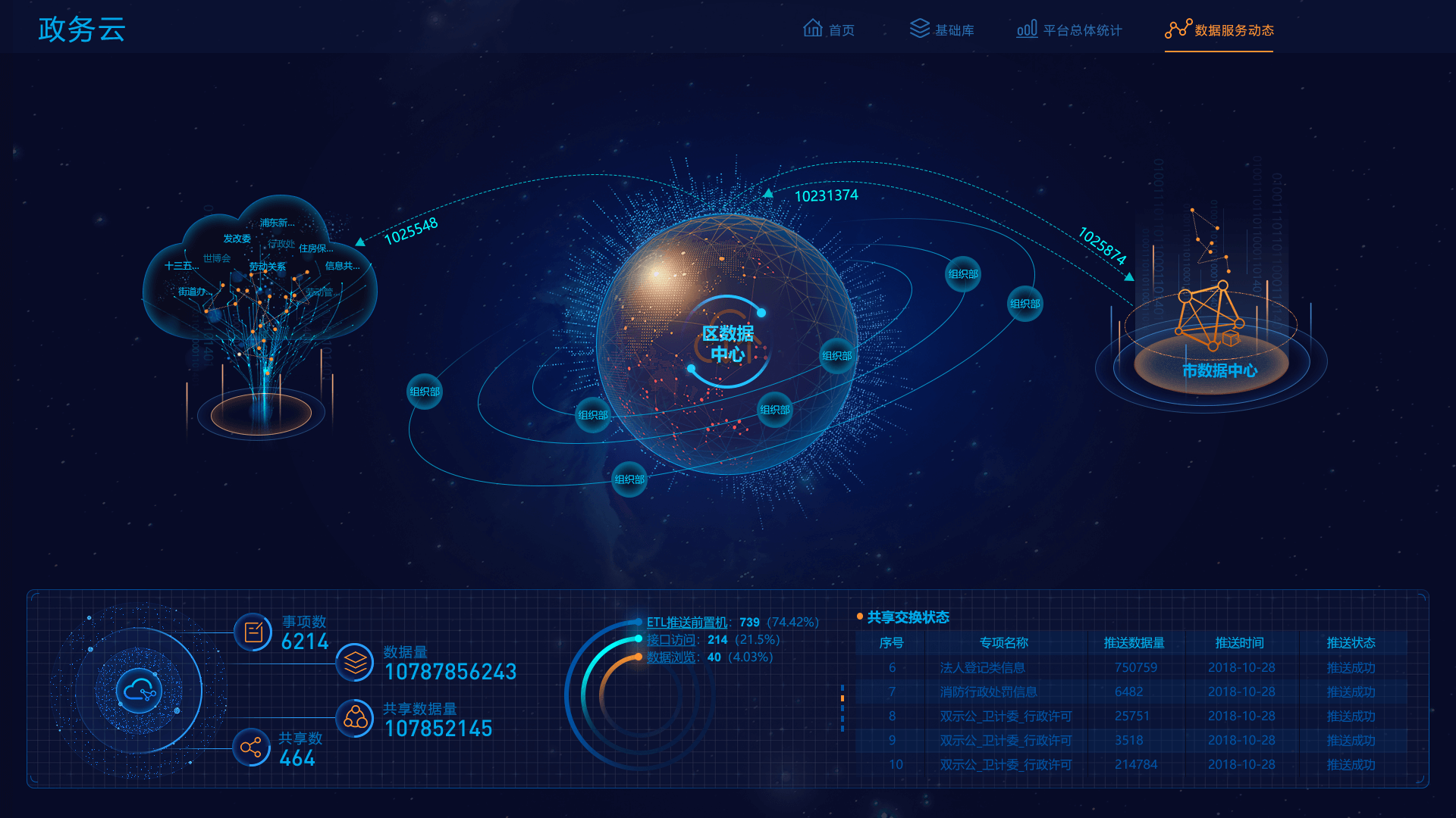 首頁展示共享方式占比、共享屬性占比、數據趨勢、熱門事項、和單位排名等,基礎庫包括人口庫、法人庫,支持搜索刷新,同時展示庫的基本信息和申請動態,平臺總體統計展示平臺各類指標數據的訪問、更新情況,數據服務動態展現區數據中心和市數據中心等的數據實時交互狀況,實現數據全方位全時段把控。